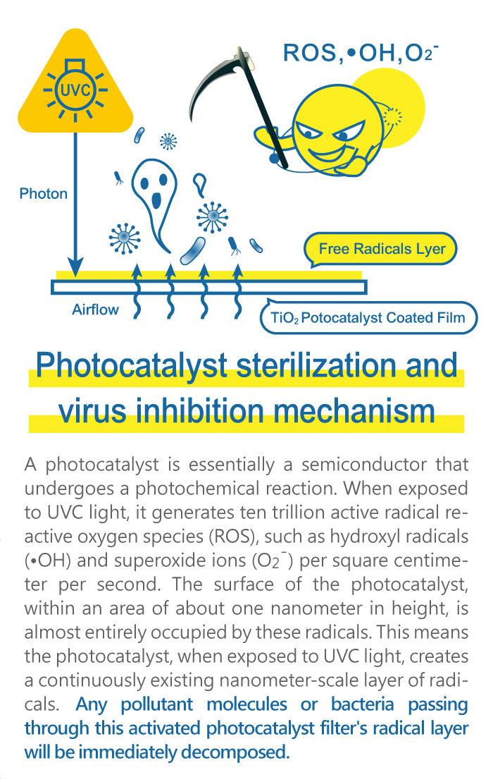 However, similar to the situation with ultraviolet sterilization, photocatalysis also requires time to degrade organic substances. According to the research data from the Environmental Engineering Institute at National Chiao Tung University, the degradation of Volatile Organic Compounds (VOCs) takes several seconds to several tens of seconds. If photocatalysis is used without a filter, the reaction time is insufficient, rendering it ineffective. Nonetheless, if photocatalysis is incorporated into a filter and combined with genuine sterilizing shortwave ultraviolet (UVC) light high-catalytic reactions, it can provide a dual-action reaction involving longer exposure to UVC light and the catalytic effect of photocatalysis on bacteria and viruses adhering to the filter, thus achieving effective bacterial inhibition and virus elimination.