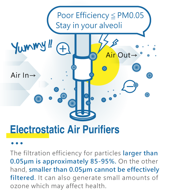 In addition, electrostatic air purifiers suffer from a fatal drawback: they rapidly lose their filtering efficiency for particles smaller than 0.05 microns, which unfortunately happen to be the particles that can penetrate your bronchi and alveoli, potentially causing cancer.